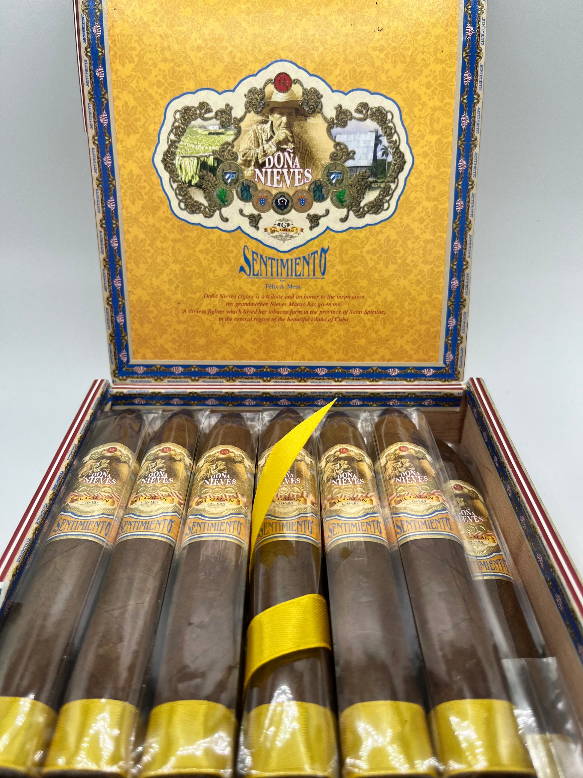Named in Cigar Journal's Top 25, the Sentimiento Ternura by Felix Mesa returns. After 4 years heading the Arturo Fuente Nicaraguan factory, this cuban born master blender reenergizes the El Galan brand. Dona Nieves is a tribute to the memory of his abuela. A medium to full smoking experience with notes of toast and woods, sure to have cigar connoisseurs sit up and take notice.